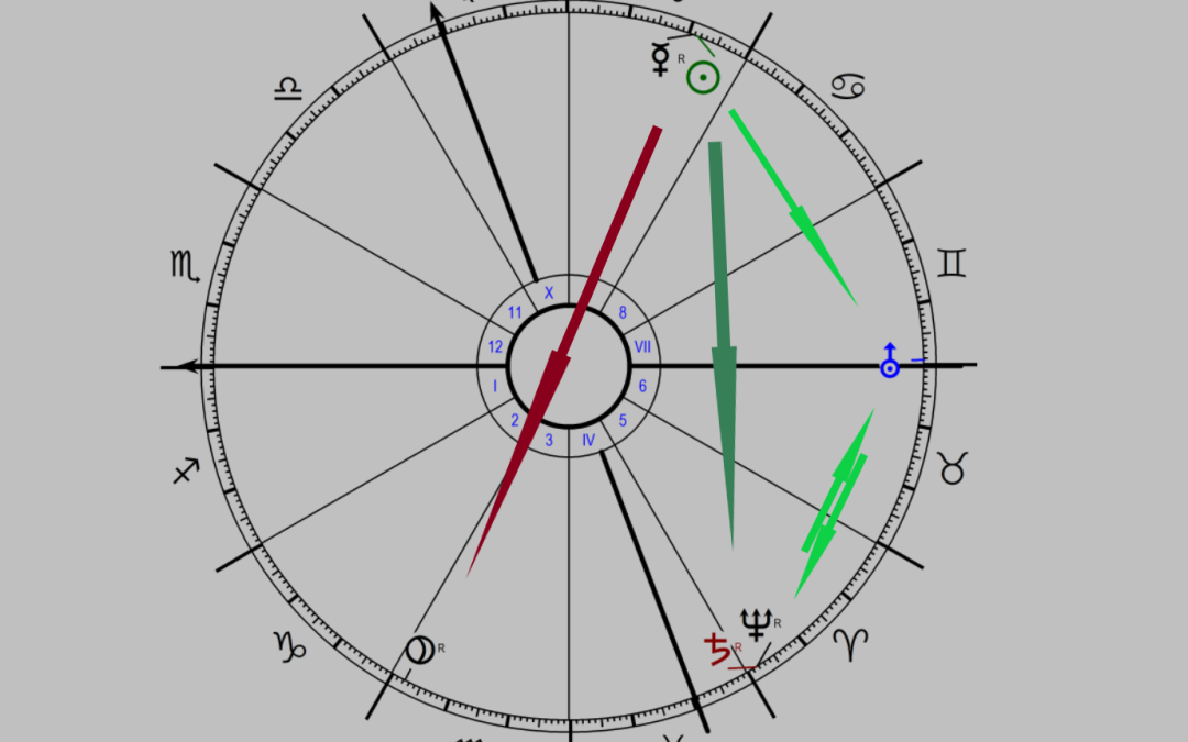 Túl sok kellemetlenséget nem okozott az utóbbi időben (ezt csak a Nap hatásaira értem), de haladásának kezdetét az Uránusszal alkotott szextil és a Szaturnusz/Neptunusz párossal képzett trigon nyitja, aminek a gyújtópontja az Uránusz. Ezt kissé megnehezíti egy Plútóra vetett oppozíció és a retrográd mozgását megkezdő Merkúr, amivel indul egy közelítő konjukció.