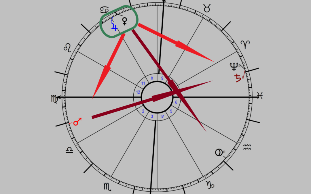 Haladása a retrográd Plútóval képződő oppozícióval és egy Mars/Szaturnusz/Neptunusz T-kvadráttal kezdődik, ahol a Vénusz gyújtópont.